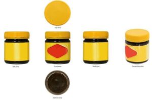 “The Trade Mark consists of the shape of a jar and lid, with the jar bearing a yellow-coloured label including a red-coloured logo, the lid being yellow-coloured and the jar having a contrasting brown colour, as shown in the representation(s) attached to the application form.”